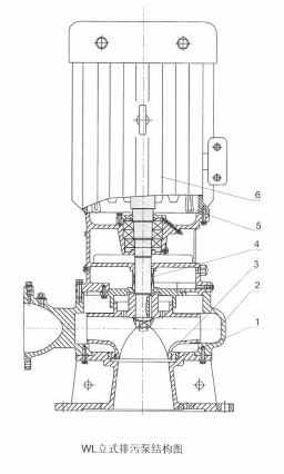 WL系列排污泵為立式結(jié)構(gòu),泵與電機(jī)共軸,單級(jí)單吸蝸殼式排污泵。該系列泵安裝簡(jiǎn)單,維修方便。泵的轉(zhuǎn)向從電機(jī)端看為順時(shí)針?lè)较蛐D(zhuǎn)。