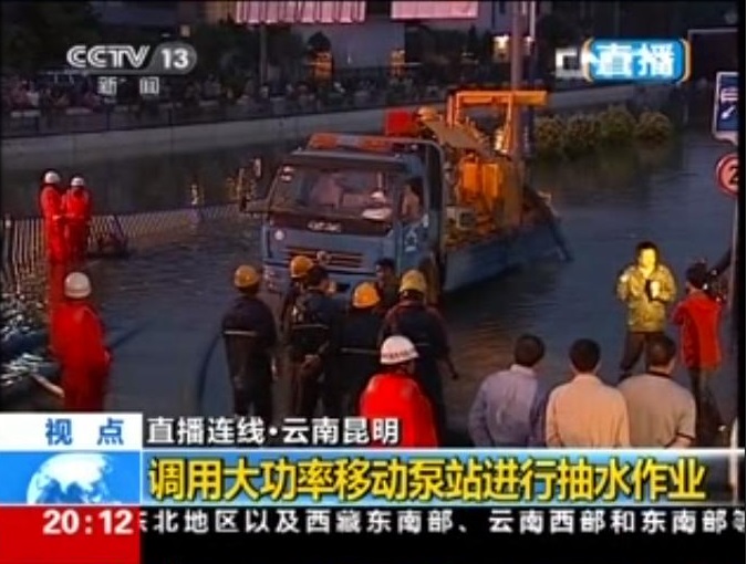 據(jù)央視7月19日“東方時(shí)空”新聞報(bào)道,從2013年7月18日早7點(diǎn)開始,云南昆明市降下了近4年以來最大的暴雨,12小時(shí)降雨量達(dá)190毫米,城區(qū)多處積水,交通受到嚴(yán)重影響。流經(jīng)城區(qū)的盤龍江流量是正常時(shí)期10倍左右,水位大幅上漲,導(dǎo)致江水倒灌。緊靠盤龍江的火車北站隧道是市區(qū)最大的淹水點(diǎn),這條長300多米的汽車和行人通道積水20000立方米左右,最深處達(dá)5米。昆明市排水公司調(diào)來了全市唯一一臺大功率移動排水泵站投入搶險(xiǎn),經(jīng)過一夜的連續(xù)工作,在早高峰前排清了積水,恢復(fù)了該城市主干道交通。