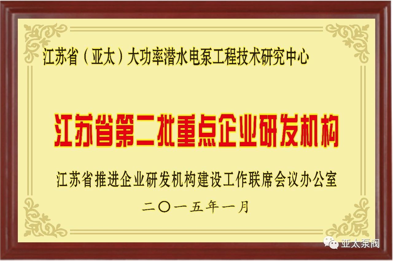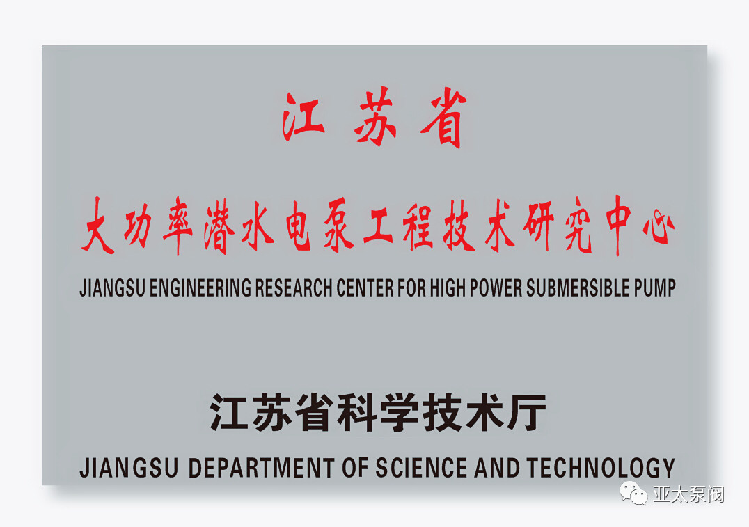 亞太泵閥有限公司是專業(yè)從事大功率潛水電泵及泵站系統(tǒng)研究的國家高新技術(shù)企業(yè),企業(yè)先后獲批國家博士后科研工作站、江蘇省企業(yè)技術(shù)中 心、江蘇省大功率潛水電泵工程技術(shù)研究中心、江蘇省研究生工作站等省級(jí)平臺(tái),技術(shù)創(chuàng)新能力顯著增強(qiáng),先后獲得國家科技二等獎(jiǎng)1項(xiàng)、省部級(jí)科技進(jìn)步獎(jiǎng)12項(xiàng)、承擔(dān)國家和省級(jí)研發(fā)項(xiàng)目11項(xiàng)、主持和參與制訂國家和行業(yè)標(biāo)準(zhǔn)8項(xiàng)。此次成功獲批省特大型潛水電泵及泵站系統(tǒng)工程研究中心,成為亞太泵閥第5個(gè)省級(jí)以上研發(fā)平臺(tái)。