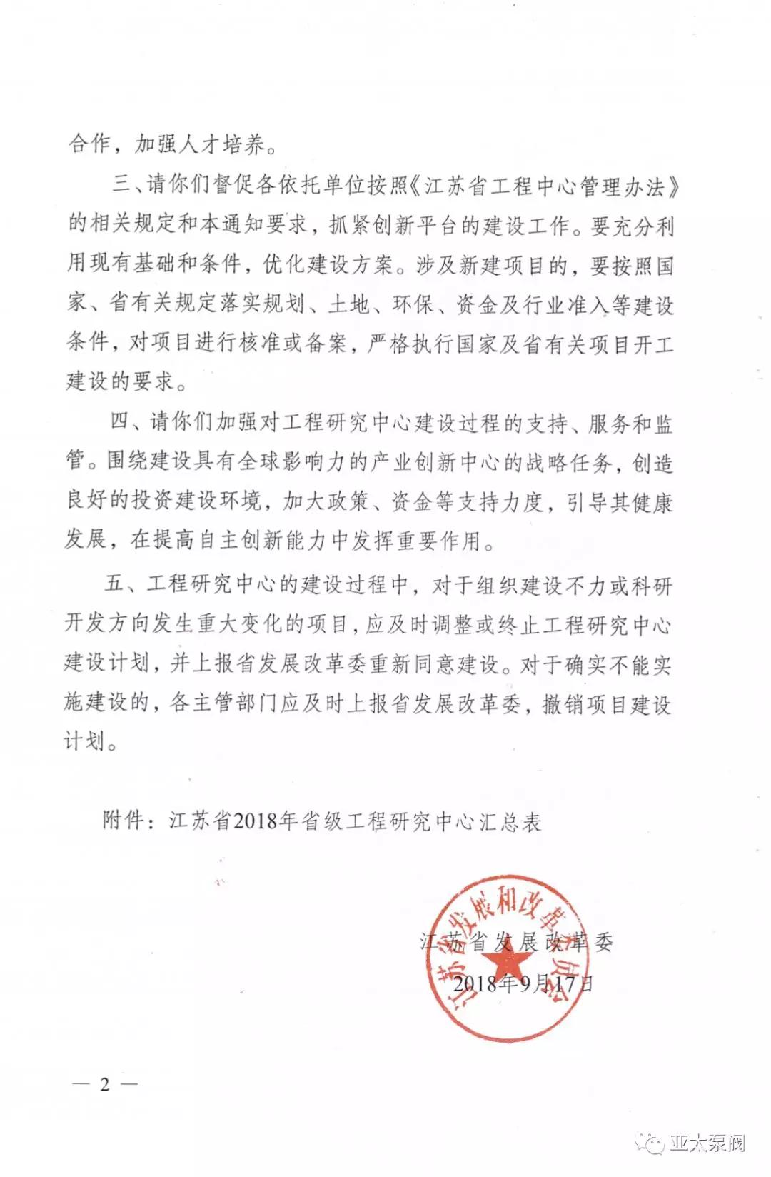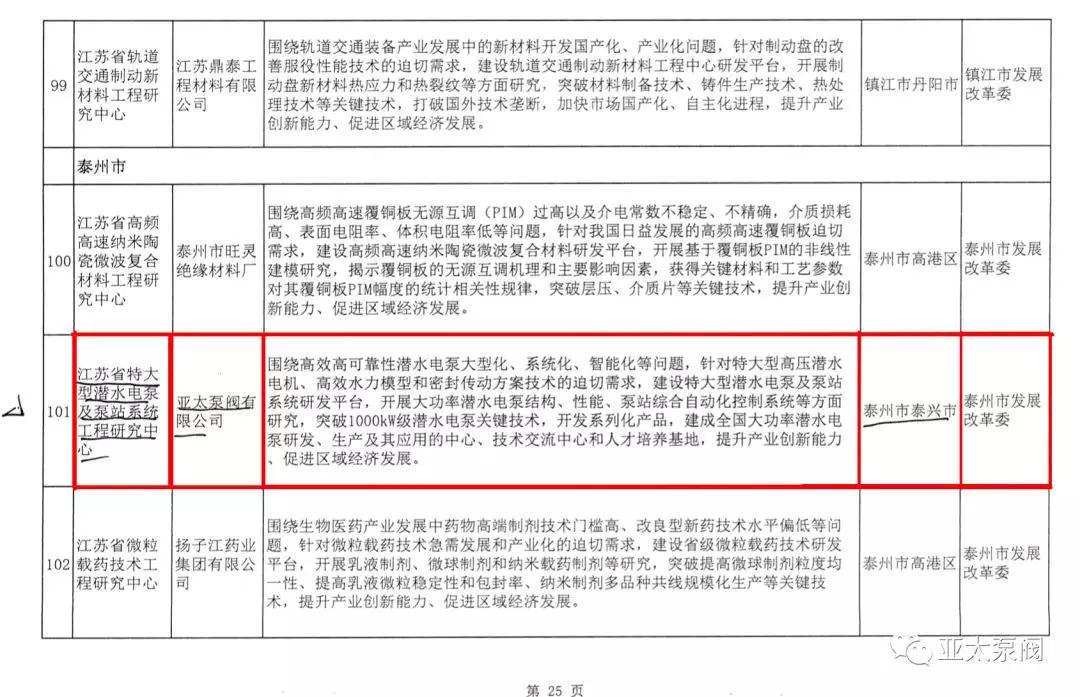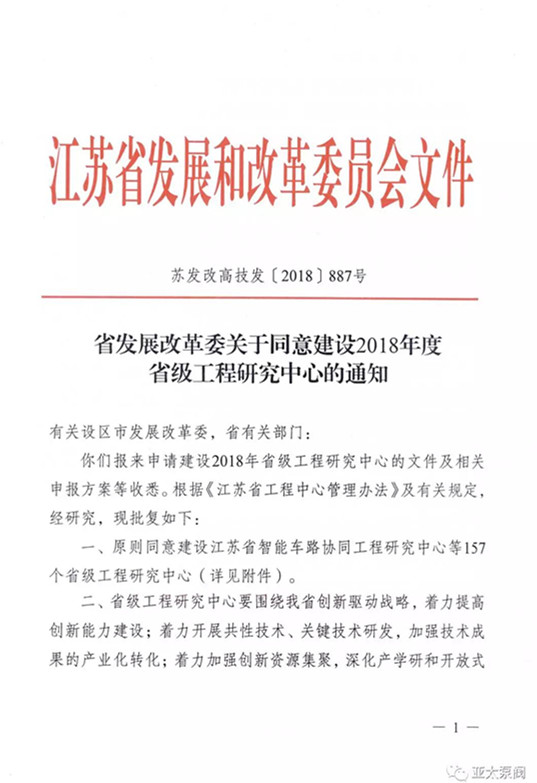 近日,省發(fā)改委正式發(fā)文,同意建設(shè)2018年度省級(jí)工程研究中心,亞太泵閥有限公司申報(bào)的省級(jí)創(chuàng)新平臺(tái)江蘇省特大型潛水電泵及泵站系統(tǒng)工程研究中心成功獲批,成為我省水泵行業(yè)唯 一入選企業(yè)。